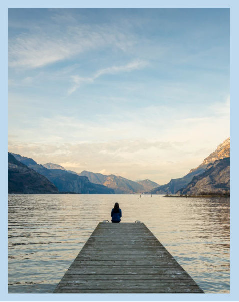 Still lake and mountains with a person looking out over the water from a jetty